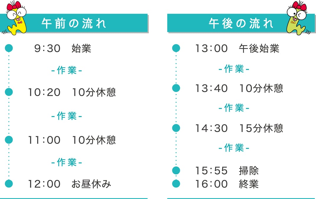 当施設は、9:30~16:00までの利用になります。個人の体調や予定に合わせてご利用いただけます。個別にもご対応させていただいております。