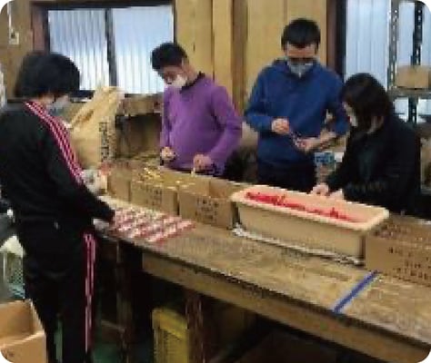 「楽しく一諸にモノ造り」をスローガンに、簡単な袋詰め作業やシール貼り等を納期を守りミスのない作業環境の工程づくりに取り組んでいます。